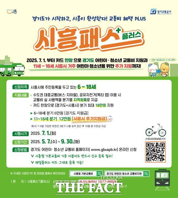 [더팩트|시흥=김동선 기자] 경기 시흥시가 오는 7월 1일부터 어린이·청소년 교통비 지원을 통합·확대한 '시흥패스+(플러스)' 사업을 시행하고, 7일부터 사전 신청을 접수한다.
