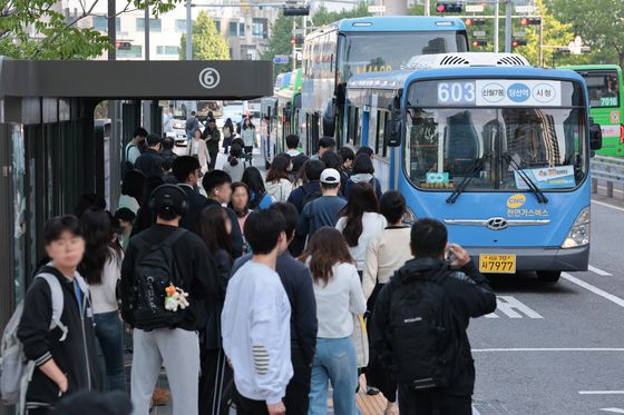 서울 시내버스 노조가 연휴가 끝난 뒤 첫차부터 준법투쟁(준법운행)을 재개한 7일 서울역 앞 버스환승센터 정류장에서 출근길 시민들이 버스에 탑승하고 있다. 연합뉴스