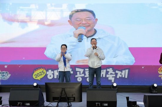 (좌측)박지원 국회의원과 명현관 군수가 축제 개막식에서 환영 인사말을 하고 있디. 해남군 제공 |