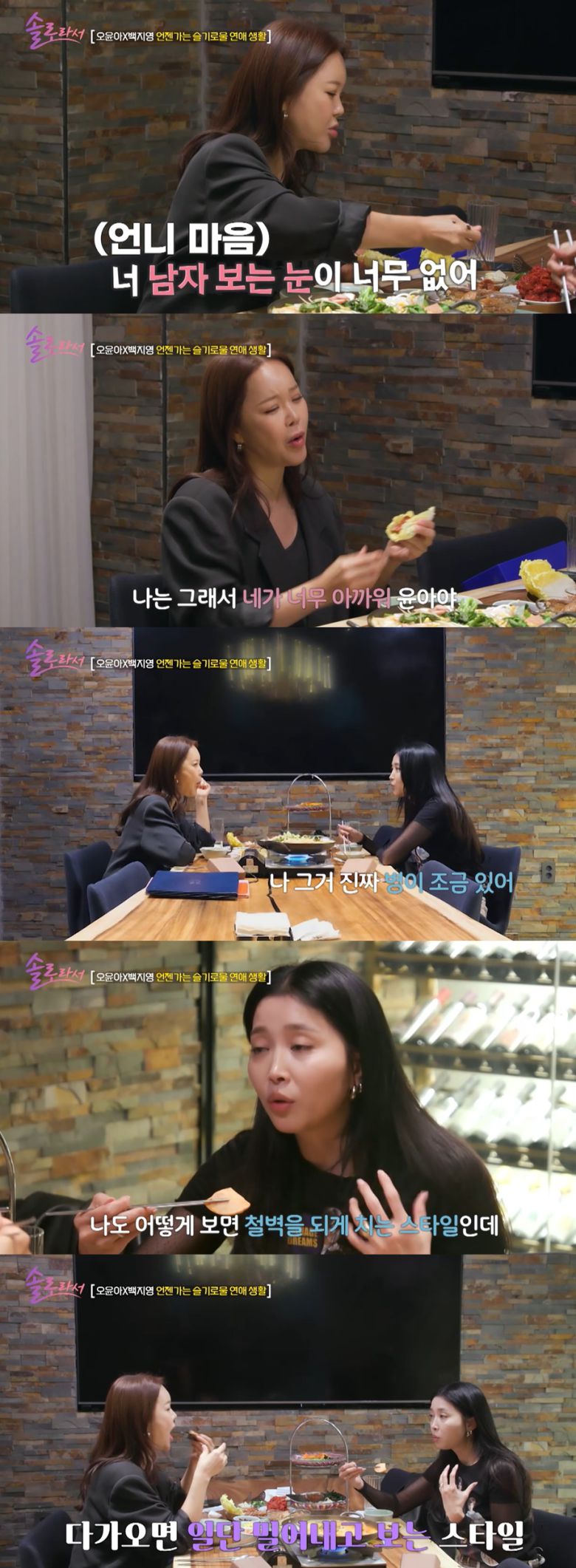 백지영은 "네가 너무 아깝다"며 안타까움을 드러냈고, 오윤아는 "사람 보는 눈이 없는 게 아니라 병이 조금 있다"며 "예전에는 어떻게 보면 철벽을 되게 치는 스타일인데 처음에 다가오면 (밀어낸다)"고 전했다.