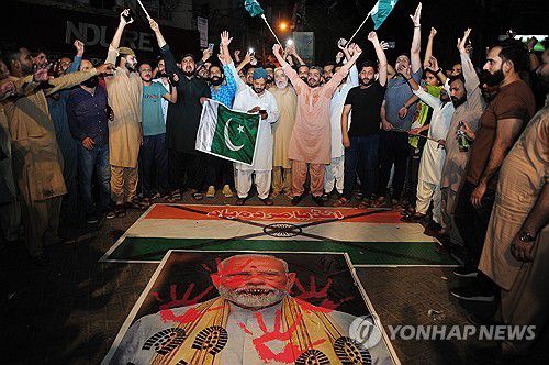 파키스탄서 반인도 시위인도가 미사일 공습을 감행한 7일(현지시간) 파키스탄에서 반인도 시위가 벌어지고 있다. [EPA 연합뉴스. 재판매 및 DB 금지]