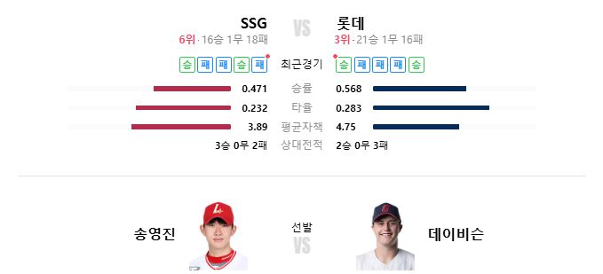 [스타데일리뉴스=정상훈기자] SSG 랜더스가 7일 오후 6시 30분 부산 사직야구장에서 롯데 자이언츠와 맞대결을 펼친다. 이날 SSG는 선발 투수로 송영진을 예고했다. 송영진은 시즌 2승 2패, 평균자책점 4.85, WHIP 1.54를 기록 중이며, 직구(143km/h)를 중심으로 커브(116km/h)와 슬라이더(134km/h)를 섞어 던진다. 롯데전에서는 1승 무패, 평균자책점 1.42로 강한 면모를 보여 왔다.