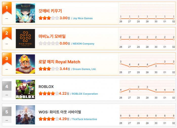 상위권에서는 기존 강자들도 여전히 건재하다. '로얄매치', '로블록스', 'WOS: 화이트 아웃 서바이벌'은 각각 3위, 4위, 5위에 올라 '갓깨비 키우기'의 아성을 노리고 있다. 원조 터줏대감 '라스트 워: 서바이벌'은 지난주보다 한 계단 상승해 안정적인 상승세를 이어가고 있다.