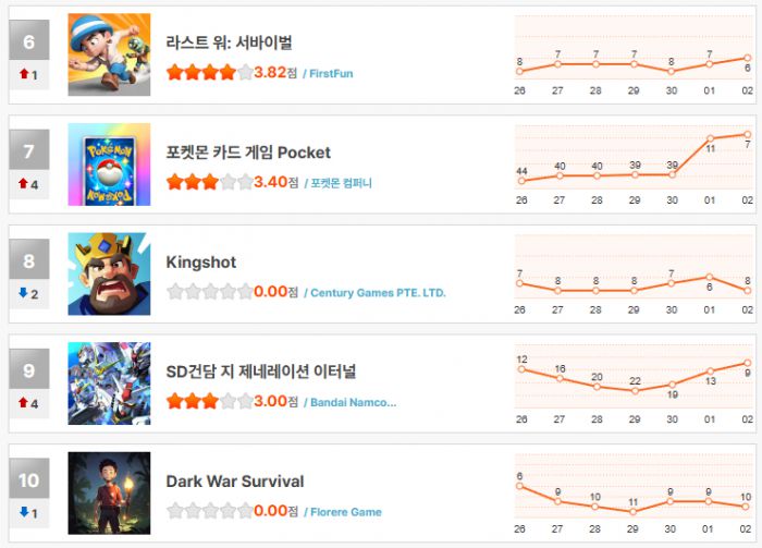 특히 눈에 띄는 복귀 사례로는 ‘포켓몬 카드 게임 Pocket’이 있다. 한때 40위권까지 밀려났던 이 게임은 다시 7위로 반등하며 저력을 과시했다. 반면 ‘로얄매치’의 아류작으로 논란이 된 ‘킹샷’은 8위를 유지하며 여전한 인기를 보여줬다.