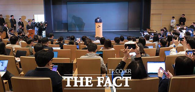 [더팩트ㅣ남윤호 기자] 최태원 SK그룹 회장이 7일 오전 서울 중구 SK텔레콤 T타워 SUPEX홀에서 SK텔레콤의 해킹 사고에 사과하며 고개숙이고 있다.