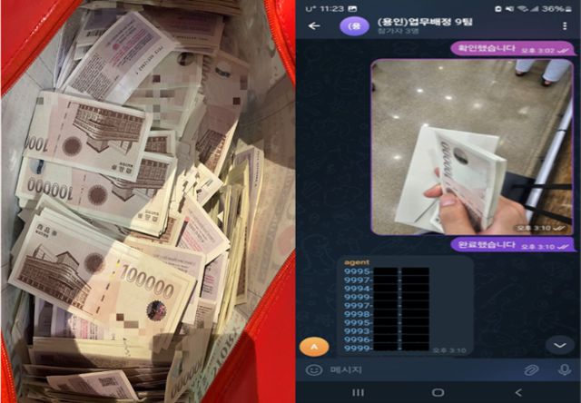 일당이 해킹한 모바일상품권을 교환해 확보한 지류상품권이 수북하게 쌓여있다.(왼쪽 사진) 텔레그램 대화방에 상품권을 지류로 바꾼 교환책이 '완료했습니다'라고 보고하고 있다. 서울경찰청 제공 |