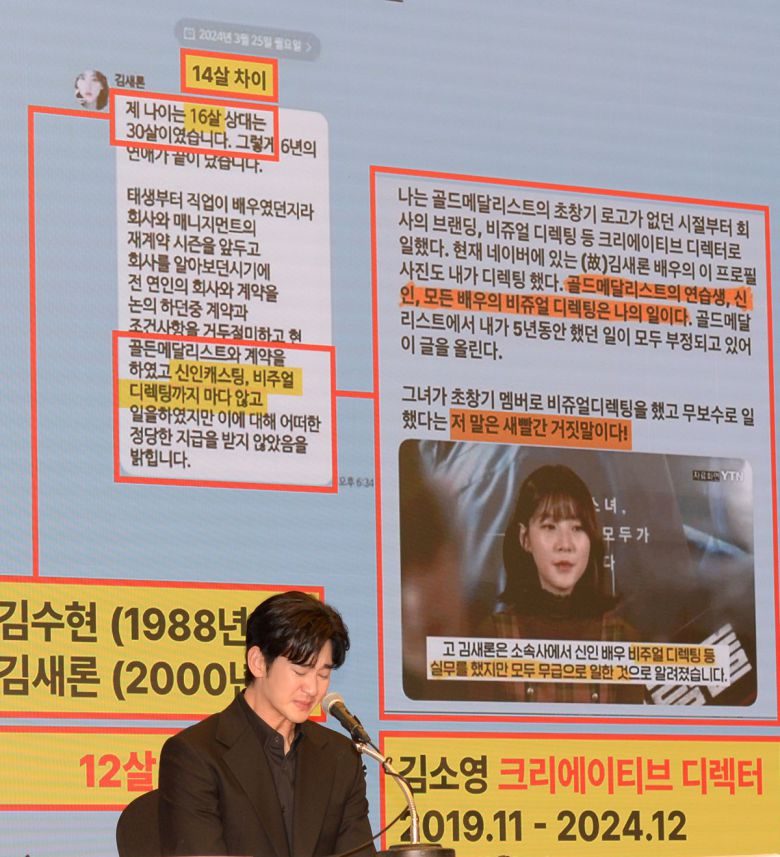 김수현은 지난 3월 故 김새론 측 유족이 고인의 미성년 시절 김수현과 교제를 주장하면서 미성년자 그루밍 논란에 불거졌다. 고인의 전 소속사이자 김수현의 현 소속사인 골드메달리스트와 함께 고인의 음주운전으로 인한 피해 보상 관련 채무 압박을 가했다는 의혹까지 휩싸였다.