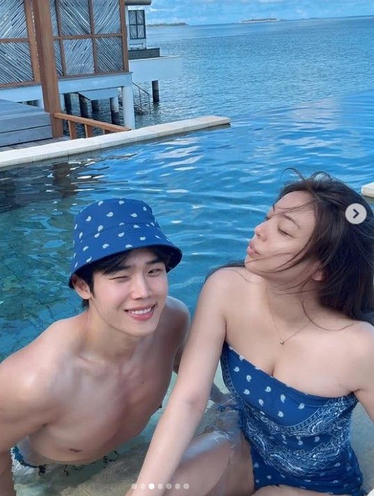 공개된 사진 속 에일리와 최시훈은 몰디브 리조트 수영장에서 여러 밀착 포즈를 취하며 로맨틱한 분위기를 자아낸다.