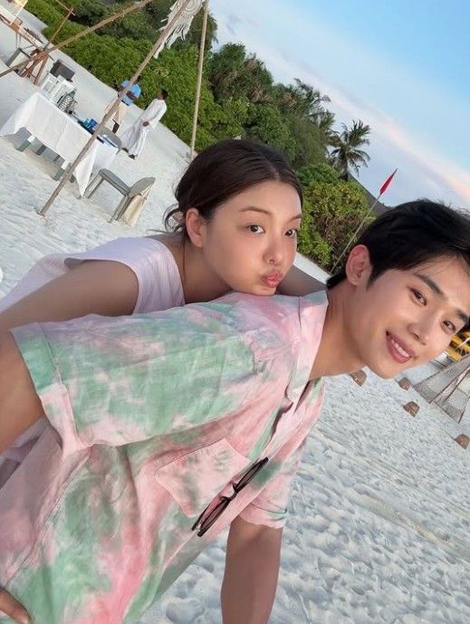 커플 비치웨어를 맞춰 입고 수영장에 나란히 앉은 모습, 코코넛 음료를 들고 해맑게 웃는 셀카, 그리고 백허그샷까지 ‘허니문 케미’가 제대로 터졌다.
