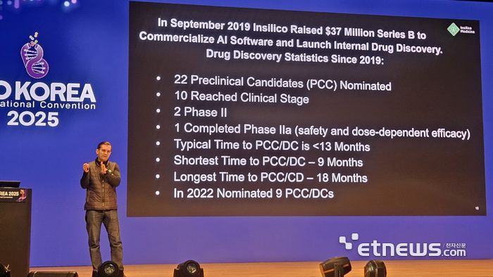 이날 행사 기조연설을 맡은 알렉스 자보론코프 인실리코메디슨 설립자 겸 최고경영자(CEO)는 “회사 설립 후 AI를 활용해 발굴한 물질 4개를 제약사에 기술이전 하는 성과를 거뒀다”면서 “AI를 활용해 20건 이상의 전임상 후보물질을 발굴했는데, 특히 가장 짧게는 9개월 만에 임상시험 진입 직전단계(PCC/DC)에 이르렀다”고 설명했다.