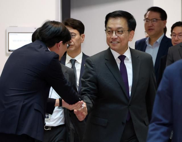 2일 사퇴한 최상목 전 경제부총리 겸 기획재정부 장관이 7일 세종시 정부세종청사 기재부를 찾아 직원들과 인사를 나누고 있다. 뉴시스 |