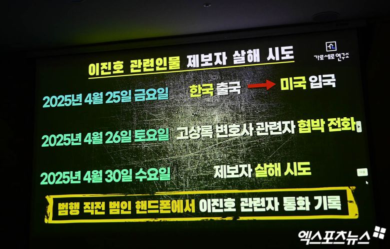 (엑스포츠뉴스 박지영 기자) 7일 오후 서울 삼성동 스페이스쉐어에서 삼성역센터에서 배우 故 김새론 유가족의 기자회견이 진행됐다. 이날 기자회견에 참석한 김새론 유족 측 법률대리인 법무법인 부유 부지석 변호사와 가로세로연구소(가세연) 김세의 대표가 유튜버 이진호의 관련인물 제보자 살해 시도를 공개하고 있다.박지영 기자 jypark@xportsnews.com이 기사의 카테고리는 언론사의 분류를 따릅니다.0공유하기