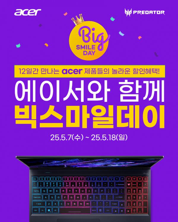 [디지털포스트(PC사랑)=남지율 기자] 에이서(Acer)가 오는 5월 18일까지 진행하는 G마켓과 옥션의 연중 최대 쇼핑 축제인 '빅스마일데이'에서 자사의 인기 노트북 13종을 최대 47% 할인된 가격에 판매한다고 밝혔다.