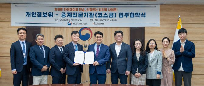 [이데일리 김현아 기자] 개인정보보호위원회(위원장 고학수)가 7일 정부서울청사에서 금융정보 전문기관인 코스콤(대표 윤창현)과 ‘전 분야 마이데이터 중계업무 협력’을 위한 업무협약(MOU)을 체결했다.