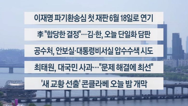 더불어민주당 이재명 대선 후보는 법원의 공판 연기에 "당연히 해야 할 합당한 결정"이라고 말했습니다. 국민의힘 김문수 대선 후보와 무소속 한덕수 대선 예비후보가 오늘 오후 회동을 통해 후보 단일화 문제를 논의합니다.