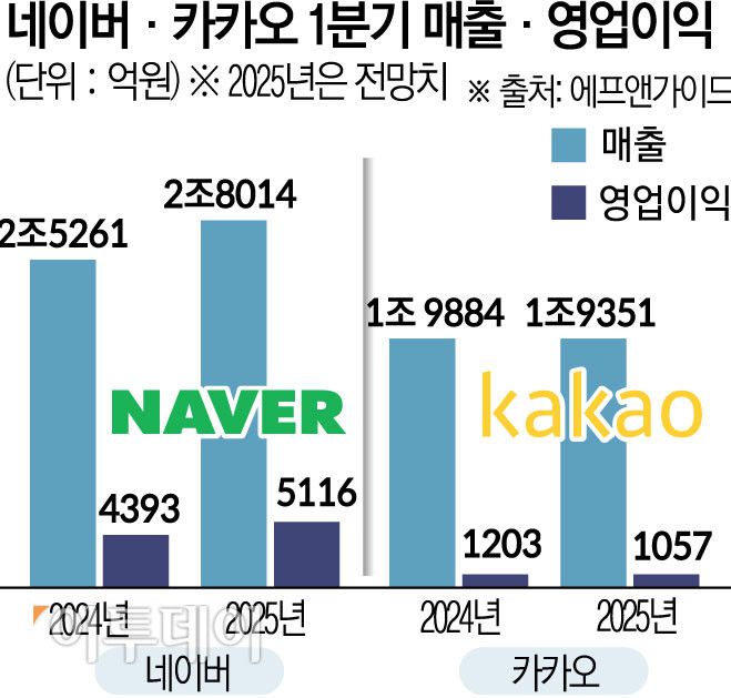 7일 에프앤가이드에 따르면 네이버의 올해 1분기 매출액은 2조 8014억 원, 영업이익은 5116억 원으로 전년 동기 대비 각각 10.9%, 14.1% 증가할 전망이다.