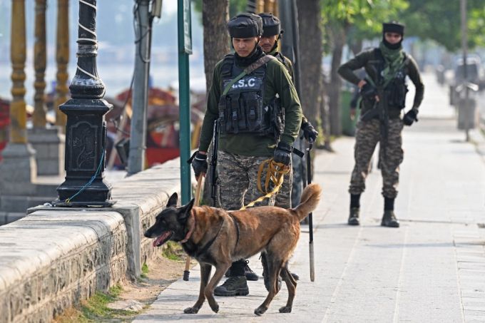 7일(현지시간) 인도 경찰이 인도령 카슈미르 지역 주도인 스리나라그에서 순찰을 돌고 있다./AFPBBNews=뉴스1 |