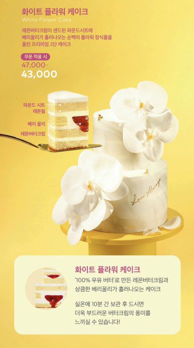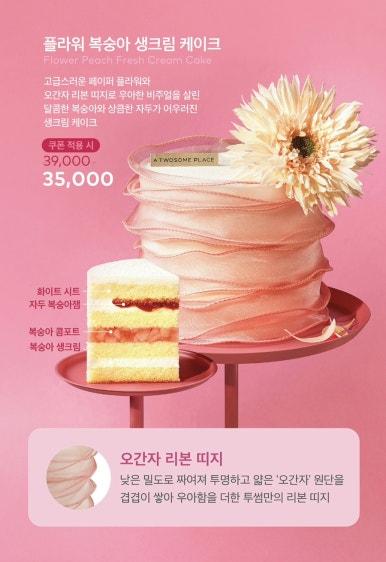 이번 가정의 달을 맞아 투썸플레이스가 선보인 케이크는 2종인데요. 순백의 플라워 장식이 돋보이는 2단 케이크 ‘화이트 플라워 케이크’와 오간자 리본 띠지로 부드러운 색감을 더한 ‘플라워 복숭아 생크림 케이크’입니다. 가격은 각각 4만3000원, 3만9000원으로 레몬버터크림이 샌드된 파운드시트에 베리꿀리, 자두 복숭아잼과 북숭아 콩포트, 복숭아 생크림이 어우러진 생크림 케이크입니다.