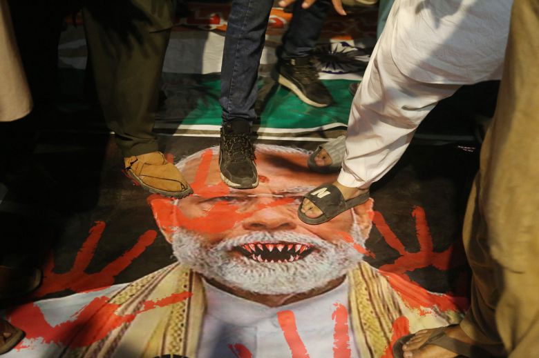7일 (현지시간) 파키스탄 하이베라바드에서 열린 인도 반대 시위에서 시위대가 나렌드라 모디 인도 총리 사진이 담긴 현수막 위에 서 있다. [AFP]