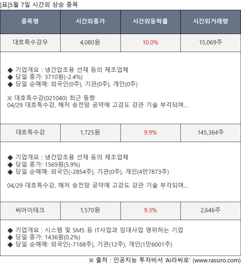 [서울=뉴스핌] 로보뉴스 = 5월 7일, 인공지능 투자비서 ‘AI라씨로’는 시간외 단일가 매매에서 주가가 크게 변동한 대호특수강우(021045), 대호특수강(021040) 등의 최근 동향을 분석해서 발표했다.