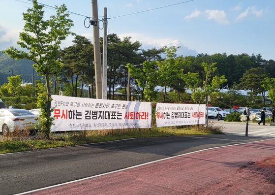그런데 이날 경기장 주변 분위기는 평소와 사뭇 달랐습니다. 경기장 입구 도롯가에 '강원 FC와 축구를 사랑하는 춘천시민, 축구인, 팬을 폄훼하는 김병지 대표는 사퇴하라'는 내용의 현수막이 내걸렸습니다. 춘천시 축구협회와 일부 강원 FC 팬, 시민들이 만들었습니다.