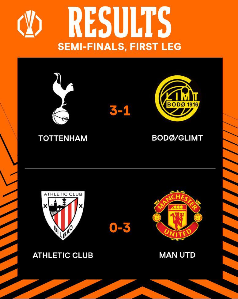 준결승 2차전이 남아 있긴 하지만 현 시점에서 UEFA 유로파리그 결승 진출 가능성이 가장 높은 팀은 토트넘과 맨유이다. 토트넘은 보되/글림트와의 준결승 1차전에서 3-1 승리를 거뒀고, 맨유도 아틀레틱과의 준결승 1차전을 3-0 완승으로 마무리했다.