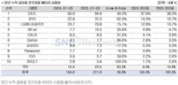 LG에너지솔루션은 전년 동기 대비 15.1%(23.8GWh) 성장하며 3위를 유지했다. SK온은 35.6%(10.5GWh)의 성장률을 기록해 4위에 올랐다.