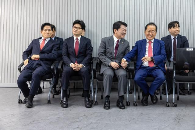 지난달 29일 여의도 국민의힘 중앙당사에서 김문수(왼쪽부터), 한동훈, 안철수, 홍준표 후보가 3차 경선 결과를 기다리고 있다. 뉴시스