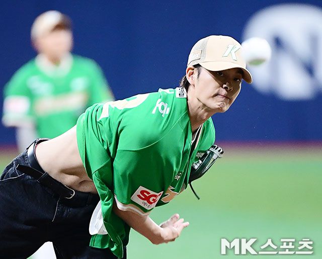 경기에 앞서 배우 유선호가 시구를 하고 있다.