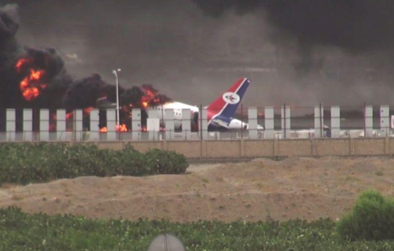 이스라엘이 예멘 수도 사나의 국제공항을 공습한 가운데 항공기가 불길에 휩싸여 있다. EPA=연합뉴스 |