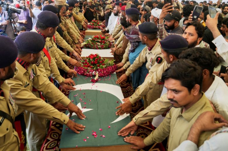 파키스탄군 등 관계자들이 7일 파키스탄 펀자브 주 무리드케에서 인도 미사일 공격으로 의심되는 사건 희생자들을 위한 장례식을 올리고 있다. AP=연합뉴스 |