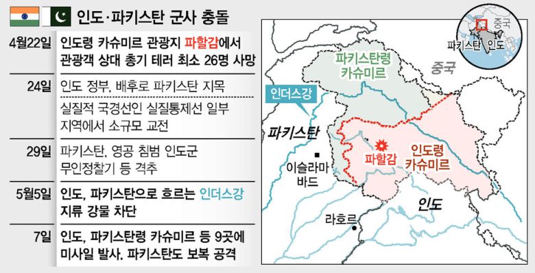 26명이 숨진 인도 카슈미르 관광객 테러 사건 이후 갈등을 빚어오던 인도와 파키스탄이 7일(현지시각) 미사일 공격을 주고받은 데 이어, 카슈미르를 가로지르는 실질적 국경선인 ‘실질 통제선’(Line of Control) 일대에서 격렬한 포격전을 벌였다. 이로 인해 최소 36명이 사망하는 등, 2003년 양국 휴전 협정 이후 심각한 규모의 무력 충돌이 빚어졌다고 로이터 통신 등이 전했다. 두 나라 모두 핵무기 보유국이어서, 전면전으로 확대될 가능성을 셈하며 국제사회가 긴장하고 있다.
