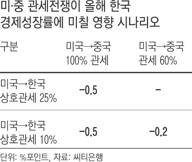김진욱 씨티은행 수석이코노미스트는 지난달 말 발표한 ‘한·미 통상 협상의 경제적 영향’ 보고서에서 미국과 중국이 올 2분기부터 서로 100% 넘는 상호관세를 부과한다면 올해 한국 성장률은 0.5%포인트 떨어진다고 분석했다.