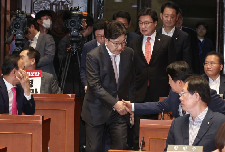 7일 오후 국회에서 열린 국민의힘 의원총회에서 권성동 국민의힘 원내대표가 입장하고 있다. 윤운식 선임기자 yws@hani.co.kr |