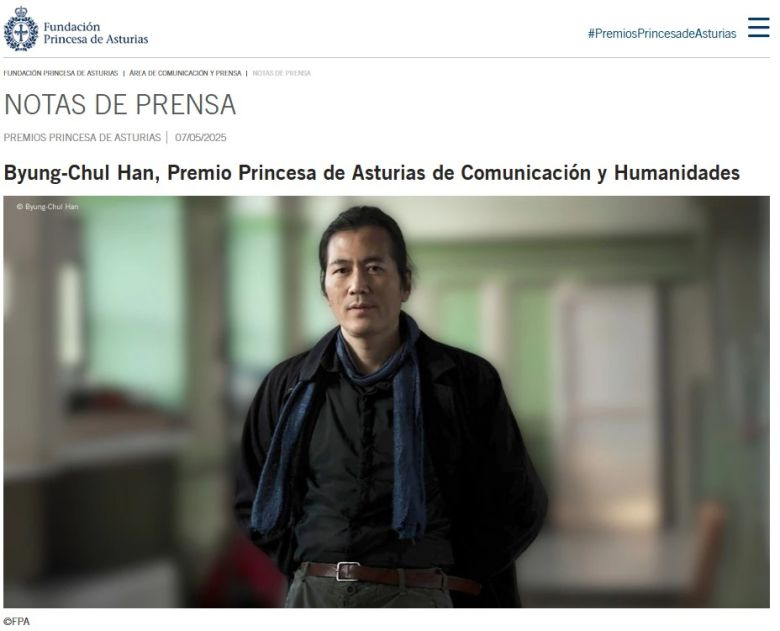 한병철의 수상 소식을 알리는 아스투리아스 공주상 홈페이지. |