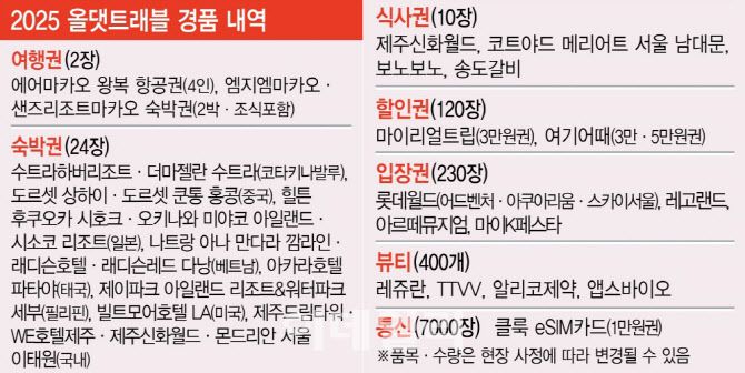 [이데일리 이선우 기자] 오는 10일까지 삼성동 코엑스(3층 D홀)에서 진행되는 ‘2025 올댓트래블’에서 절대 놓치지 말아야 할 코너는 1억 원 상당 여행 상품이 걸린 ‘경품 이벤트’다. 마카오 여행권(항공·숙박)부터 일본과 중국, 동남아, 제주, 서울 등 국내외 호텔·리조트 무료 숙박·식사권, 롯데월드와 아르떼뮤지엄 등 테마파크 입장권, 여기어때와 마이리얼트립 등 OTA 할인권 그리고 레쥬란, TTVV 등 뷰티용품 등 경품 구성도 ‘역대급’이다.
