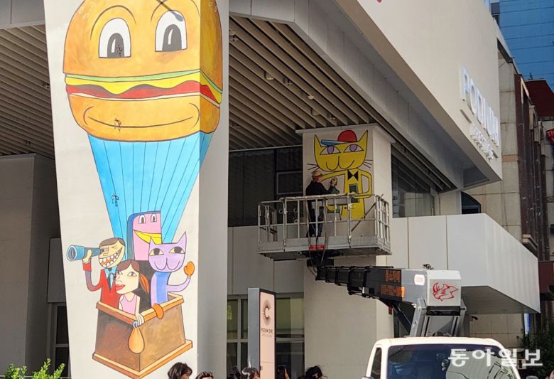 광안리해수욕장에서 도보로 5분 거리인 포디움다이브에서 지난달 17일 시작된 ‘짐 아비뇽: 21세기 스마일전’은 8월 말까지 이어진다. 부산에서의 첫 개인전을 기념해 아비뇽 작가는 지난달 29일부터 3일까지 포디움다이브 외벽에 벽화를 그리는 라이브 페인팅쇼를 선보였다.