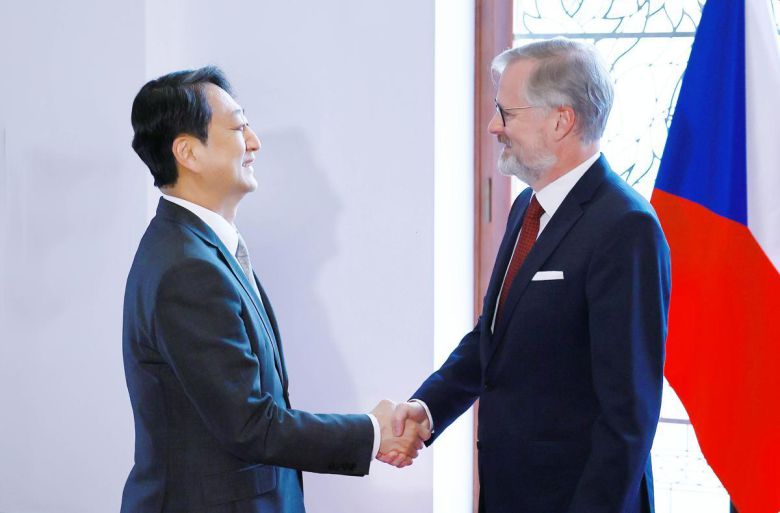 안덕근 장관, 체코 총리 만나 안덕근 산업통상자원부 장관(왼쪽)이 7일(현지 시간) 체코 프라하의 체코 총리실에서 페트르 피알라 총리를 만나 악수하고 있다. 이날 열기로 했던 신규 원전 계약 체결식은 무산됐다. 안 장관은 “한국에는 ‘비 온 뒤에 땅이 굳는다’는 속담이 있다”며 “예기치 못한 상황이 발생했지만 한국과 체코는 어려움을 함께 이겨내고 양국 간 신뢰는 더욱 굳건해질 것”이라고 밝혔다. 산업통상자원부 제공 |