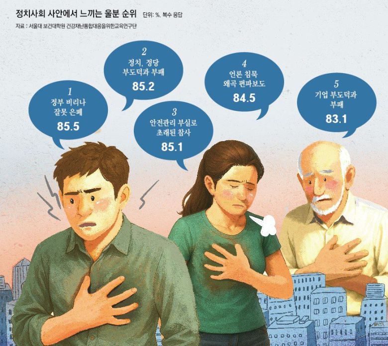 7일 서울대 보건대학원 연구팀이 공개한 ‘정신건강 증진과 위기 대비를 위한 일반인 조사’에 따르면 시민들은 정치 문제에서 주로 울분을 느꼈다. 조사에서는 ‘정부의 비리와 잘못 은폐’ ‘정치·정당의 부도덕과 부패’가 울분을 느끼게 하는 정치·사회 사안으로 1, 2위에 올랐다. 직전 조사에서는 ‘언론의 침묵·왜곡·편파보도’ ‘정치·정당의 부도덕과 부패’가 각각 1, 2위를 차지했다. 권준수 한양대병원 정신건강의학과 석좌교수는 “지난해 12월 비상계엄 이후 혼란스러운 사회 분위기도 울분을 강화한 원인 중 하나로 작용한 것으로 보인다”며 “사회적 양극화도 울분을 심화한 요인이 됐을 것”이라고 설명했다.