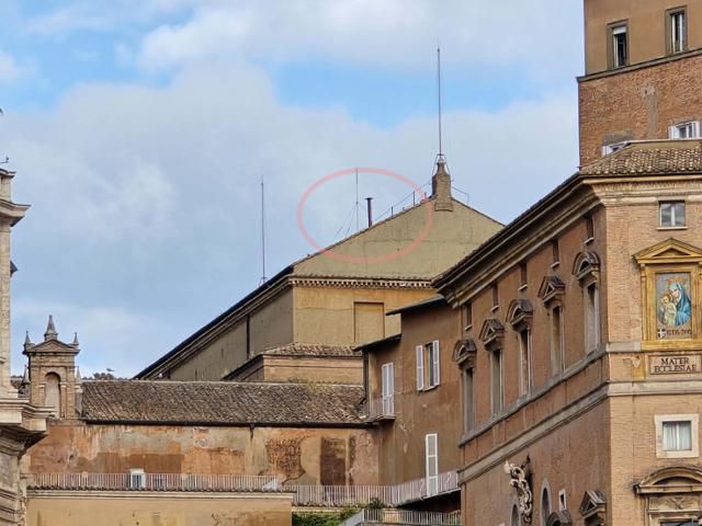 새 교황 선출을 위한 추기경들의 투표가 진행되는 바티칸 시스티나 성당 지붕에 교황 선출 결과를 알리는 굴뚝(붉은 원)이 설치돼 있다. 교황 선출 시에는 흰 연기가, 불발 시에는 검은 연기가 나온다. 바티칸=신은별 특파원 |