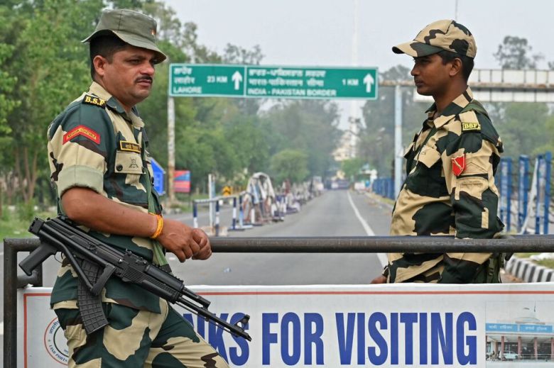 인도와 파키스탄의 무력 충돌이 발생한 7일 인도 보안군이 인도와 파키스탄 사이 와가 국경 인근에서 경비를 서고 있다. AFP 연합뉴스 |