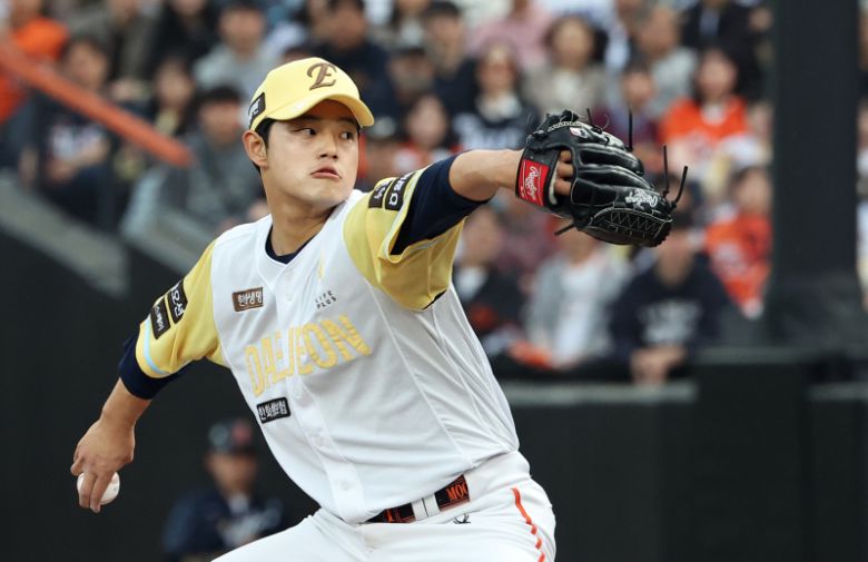 7일 대전 한화생명볼파크에서 열린 프로야구 2025 신한 SOL 뱅크 KBO리그 삼성 라이온즈와 한화 이글스의 경기에서 1회 초 한화 선발 투수 문동주가 역투하고 있다. 연합뉴스