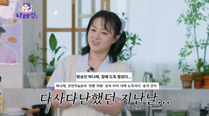 7일 유튜브 채널 '나래식'에 올라온 영상에서 박나래는 배우 조보아와의 대화 중 "최근 집에 도둑이 들었다"며 사건 전후 상황을 상세히 전했다.
