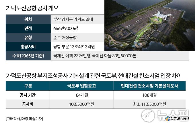 가덕도신공항 공사 개요 및 국토교통부, 현대건설 컨소시엄 간 부지조성공사 기본설계 조건 입장 차이. [그래픽=김아랑 미술기자]