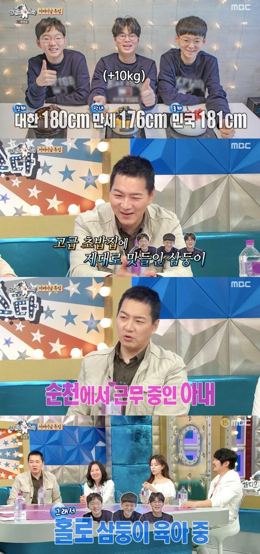오랜만에 ‘라스’ 출연인 송일국은 삼둥이가 벌써 중학생 1학년이 됐다며 대한, 민국, 만세를 언급했다. 그는 “대한이가 180cm, 민국이가 181cm, 만세가 176cm다. 그런데 몸무게는 만세가 더 나간다. 만세가 저랑 체격이 비슷하다”라고 전했다.