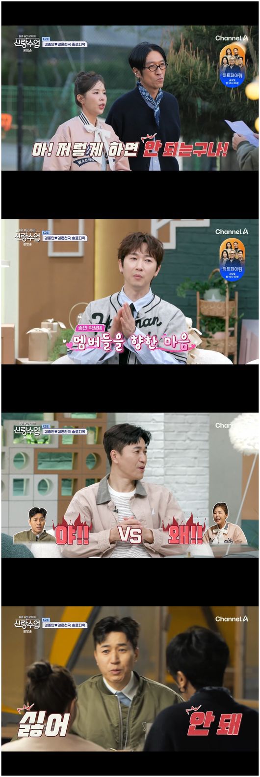 김종민은 “많은 사람 축복 속에 너희 둘이 기뻐하는 모습에, 파티에 온 줄 알았다. 내가 더 기뻤다. 너희가 동생이어도 많은 걸 배웠다. 길잡이 같았다. 난 저렇게 하면 안 되는구나, 저렇게 하지 말아야지”라면서 두 동생을 발끈하게 만들었다.