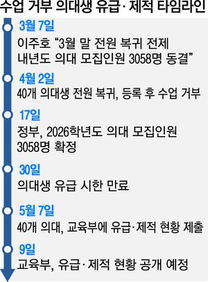 또 다른 지방 의대 관계자도 “교육부가 제적·유급 명단을 작성해 제출하라는 것은 학생 복귀 독려를 위한 ‘압박용’ 성격이 있을 것”이라며 “이미 유급 통보를 한 학교들도 있겠지만, 복귀율이 아직 미미한 상황에서 학교로서는 많은 학생들이 학교로 돌아오도록 계속 설득할 수밖에 없다”고 말했다.