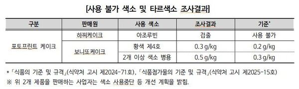 또 다른 포토프린트 케이크 1개 제품은 타르색소 함량이 사용기준을 초과한 것으로 드러났다. 이들 두 제품의 제조업체는 문제 색소 사용을 중단하겠다는 개선 계획을 발표했다.
