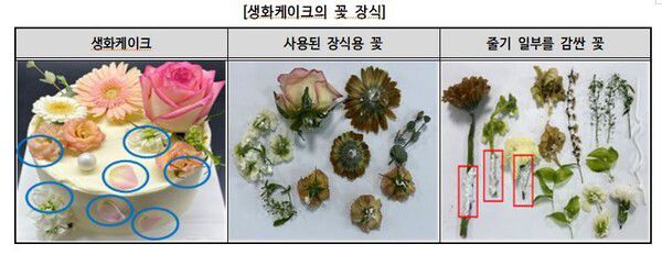 생화 장식 케이크도 안전 관리가 미흡한 것으로 나타났다. 조사된 5개 제품 모두 먹을 수 없는 비식용 꽃을 케이크에 직접 꽂거나 잎을 붙여 장식했으며, 비록 잔류농약은 검출되지 않았으나 꽃의 줄기나 잎이 케이크와 직접 닿지 않도록 조치가 부족했다.
