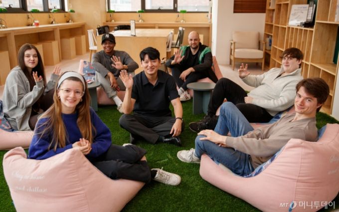 엔코위더스가 운영하는 공용주거 시설 '엔코플렉스'의 커뮤니티 공간. 오정훈 엔코위더스 대표와 입주 외국인들이 함께 기념촬영을 하고 있다. /사진=이기범 기자 leekb@ |